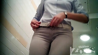 jolie dame blanche à la peau pâle dans les toilettes publiques filmée par derrière