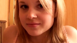 Uber-cute blonde college girl strips and spread her pink cooch lips