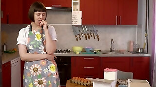 小胸部独奏女孩桑迪脸颊自慰在厨房里